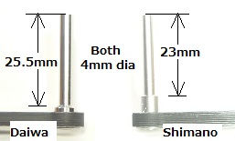 1. Daiwa has 2.5mm longer part of shaft with the diameter of 4mm. The total length of the shaft are quite similar, and 27mm for Daiwa, and 27.5-28mm for Shimano. For Shimano knobs, the lower ball bearing should sit 2.5mm higher than Daiwa's.