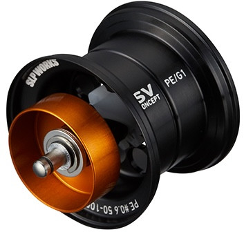 This shallow spool has SV Boost brake specifically tuned to be used with PE braided lines of thinner than #0.8. It Flat bottom, ultra light-weight 11g spool to improve casting performance. Made of G1 grade duralumin. In the SV-Boost brake, rotor will pop out far only at the beginning of casting to prevent backlash, and then it retracts to the middle to reduce brake to add casting distance. The second half spring is 4 times stronger than first half to do the trick. Casts great for heavier than 3g 1/8oz. PE0.8-150m, 0.285mm(US10lb)-70m(80yds)