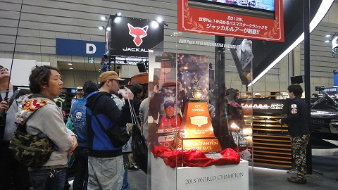 Jackall booth showing off the trophy of 2013 Bass Master Classic Championship by Mr. Cliff Pace, who used Jackall baits in the tournament. |