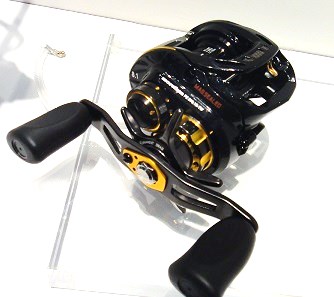Just after I checked new spinning reels, a black bait caster caught my eyes. Um? I haven't seen it before. It is a prototype of Daiwa Morethan PE SV8.1R-TW bait caster, coming out in August 2014. A Daiwa rep explains it is an almost the final prototype. The base is Daiwa Tatula, with drilled body frame with carbon accents and gold metal parts. The ultra light SV spool might make this Morethan a superb reel. I can't wait to see it in this summer. I noticed "Magsealed" letter in red on the body, and it should be the first bait caster to have a magsealed ball bearing.