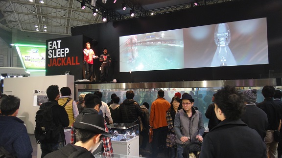 At Jackall Bros. booth, professional anglers demonstrate tactics in its exhibition tank.